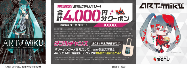 イベント会場で配布される「ART OF MIKU 配布チラシ」に付属する、menuで使用可能な「限定クーポン」を活用してデリバリーグルメをご注文いただいた方の中から、抽選で5名様に「ART OF MIKU」のメインビジュアルがプリントされた「公式トートバッグ」をプレゼントいたします。
