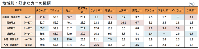 「好きなカニ」について地域別に見ると、北海道の名産品である「タラバガニ」「毛ガニ」「花咲ガニ」はやはり北海道・東北地方での支持率が最も高く、地域によって呼び方が変わる「ズワイガニ」についても、「松葉ガニ」の産地がある近畿地方での支持率が高い結果になりました。