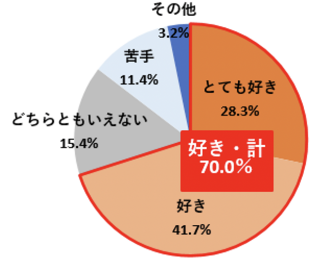 「カニを食べるのは好きですか?」という質問では、70.0%の人が「好き」(「とても好き」28.3%、「好き」41.7%の計)と回答。また、「好き」と答えた人(どちらともいえない含む)に好きなカニの種類について聞いたところ半数を超えたのは1位「タラバガニ」(62.3%)、2位「ズワイガニ」(59.4%)でした。