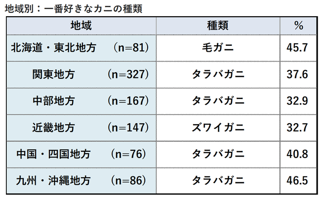 また、さらに「一番好きなカニ」については、主な産地となっている北海道・東北地方では「毛ガニ」が、漁獲量が多い港がある近畿地方では「ズワイガニ」がトップでした。産地や水揚げ港があるエリアのカニに集中するなど、地域性を強く反映していることがわかりました。