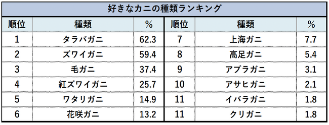好きなカニの種類は1位タラバガニ(62.3%)、2位ズワイガニ(59.4%)、3位毛ガニ(37.4%)