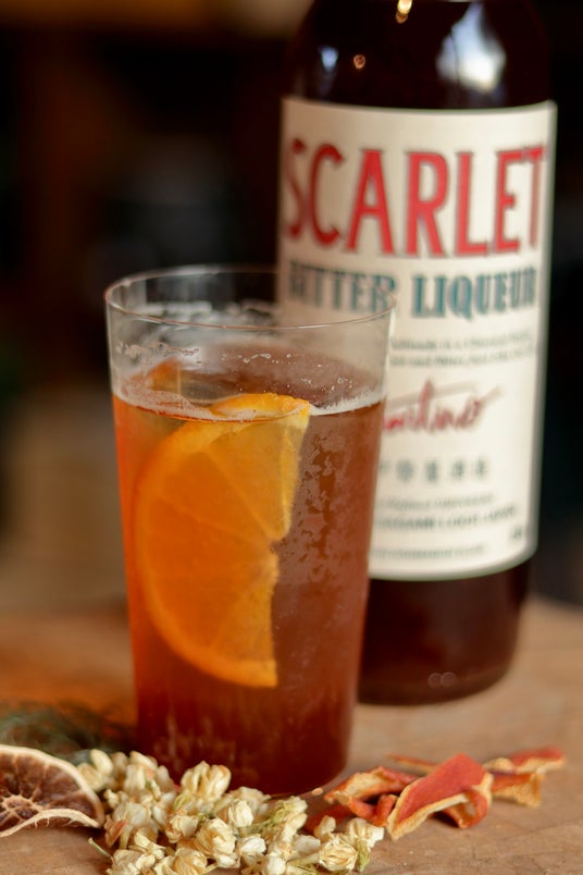 「スカーレット・アペリティーボ」は、オレンジピール、ジャスミン、ニガヨモギ、マジョラム、ホップなどを中心に25種類のボタニカルで構成されています。苦味と甘味のバランスが程よく、後からじわじわと追いかけてくるビターなテイストが癖になる1本です。