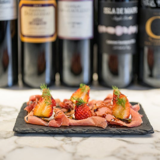 ¥979(税込)/3F Le Bar a Vin 52 AZABU TOKYOほこたいちごと14ヶ月熟成ハモンセラーノのアペリティフ切り立てのハモンセラーノに、マスカルポーネチーズとほこたいちごを合わせた一皿。塩味×酸味×甘味を楽しんで。