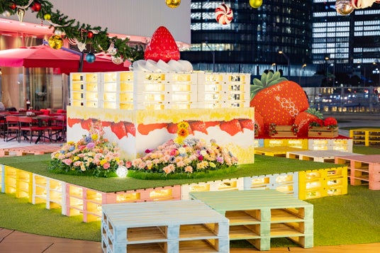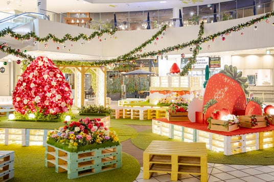 また館内広場には「Strawberry Wonderland」をテーマに、いちご型のフラワーウォールやショートケーキのオブジェが飾られ、心躍るスイートな空間が広がります。