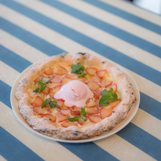 ¥1,848(税込)/4F MAR-DE NAPOLIほこたイチゴとリコッタチーズのピッツァいちごの甘み、リコッタチーズの酸味、ピッツァの塩味が見事にマッチ。温かい生地の上で溶けていくアイスのひんやり感にハマる!