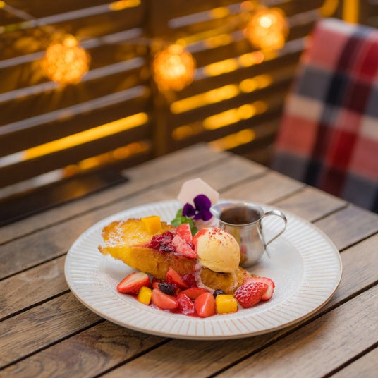 ¥680(税込)/2F babel bayside kitchenほこたいちごのフレンチトースト 自家製りんごキャラメルソース添え厚切りパンのフレンチトースト。自家製りんごキャラメルソースがいちごの甘酸っぱさを引き立てる!