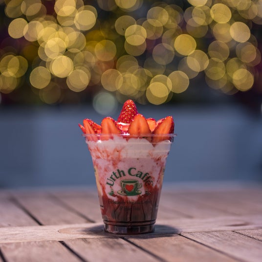 ¥900(税込)/ 3F Urth Caffeほこたイチゴをのせたストロベリーシェイクほこたイチゴをふんだんにのせたデザートドリンク。