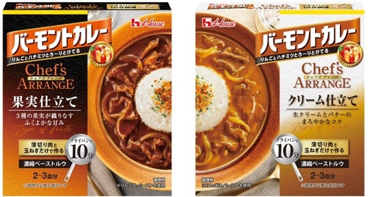ハウス食品は、発売61年目を迎える国内売上No.1※カレーブランド「バーモントカレー」から、一流シェフの知恵を取り入れた濃縮ペーストルウ「バーモントカレーシェフズアレンジ」<果実仕立て><クリーム仕立て>を、2月12日からスーパーなどで発売します。「忙しいから時間をかけられないけれど、せっかく調理するなら美味しいものを食べたい」というお客様に対応した、シェフがアレンジしたような上質な味わいのカレーを、フライパンで10分調理するだけで手軽に楽しめる製品です。内容量は果実仕立て110g、クリーム仕立て108g、オープン価格(税別参考小売価格270円)。