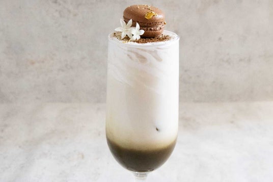 ◆凸凹ほうじ茶オーレ -山椒キャラメル×ショコラマカロン-925円(税込)ほうじ茶にキャラメルのコクをプラスし、山椒を合わせることで大人な味わいに仕上げました。金箔をふりかけたイチジク餡のショコラマカロンは、生クリームといっしょにお愉しみください。