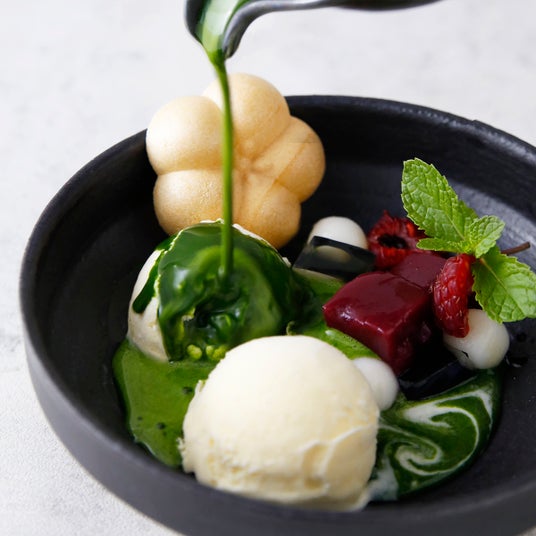 エスプレッソの代わりに放香堂の宇治抹茶『天慶』を使用。濃厚な味と香りがバニラアイスと相性抜群。白玉と寒天も入ったパフェ仕立て。