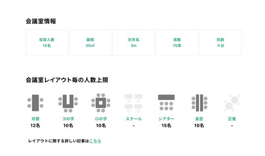 自分たちの参加会議人数によって、要望に沿った会議室をすぐにお探しいただけます。また、「会議室レイアウト毎の人数上限 」では、対面型・コの字型などのレイアウト毎に沿った人数上限をアイコンと共に記載。どのようなレイアウトに合う会議室なのか、すみやかに判別することが可能となりました。