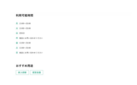 加えて、曜日ごとの会議室利用可能時間や、定休日を記載した「利用可能時間」、新人研修や経営会議などその時々にあった推奨用途を記載した「おすすめ用途」など、自分たちの日程希望や用途希望に則した会議室をお探しいただけます。