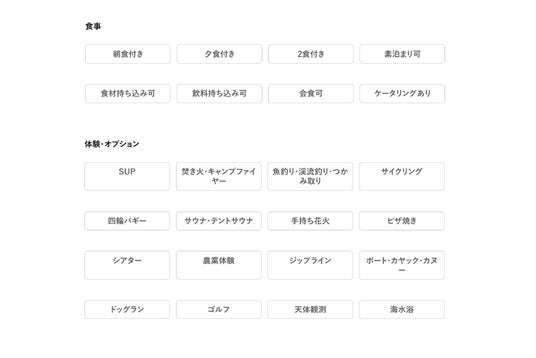 さらに、オフサイトミーティングだけでなく、その土地ならではの「非日常体験」をより楽しみたい方々に向けて、『体験・オプション』項目も追加。「SUP」「焚き火・キャンプファイアー」「サウナ・テントサウナ」「ゴルフ」など、オフサイトミーティングに加え、自然の中での体験も楽しめる施設をお探しいただけます。