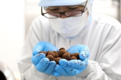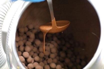 包餡機で成形されたばかりのチョコレート。この段階ではまだまん丸ではありません。銅窯の前で確認をしながら、商品のカタチを整えていきます。