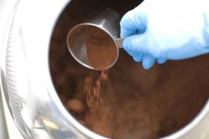 仕上げはチョコレートパウダーをムラなくかけていきます。口に入れた瞬間の幸せをつくる、大切な作業です。