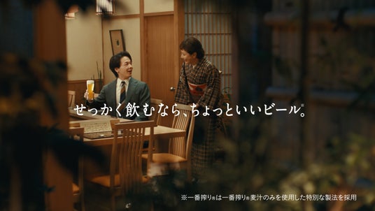 妻の実家でのまだまだ緊張する会話、一人で訪れた割烹独特の雰囲気に背筋が伸びながらも、「一番搾り(R)」の魅力を伝える義父、女将とのやり取りを通して、中村さんがそのおいしさを再発見し、いつの間にかリラックスした時間が流れていく新TVCMにご注目ください。