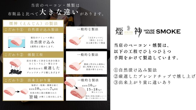 ハムやベーコンの原料は豚肉ですが、大手メーカーではゼリー状のつなぎを注射器で注入することで20~30%重さをかさ上げし、グラム当たりの単価を安くしています。煙神では、保存料や添加物を極力使わない手作りにこだわっています。
