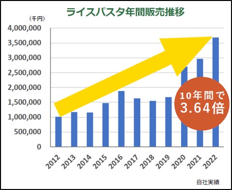 「ライスパスタ」は、健康意識の高まりやグルテンフリー市場の拡大により、注目度が上昇しています。そのことにより、2012年から10年で3倍以上の売上となりました。