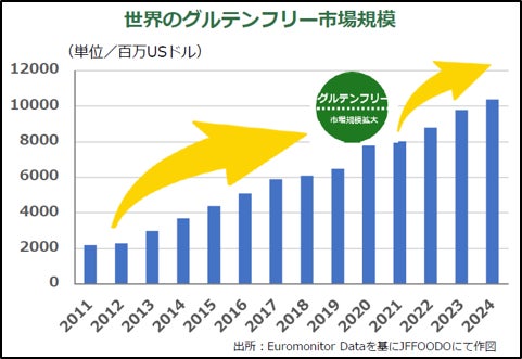 グルテンフリー市場は世界的に拡大しており、2005年からの20年間で市場規模が約13倍に達する見込みです。農林水産省によると、2024年には100億ドル規模に成長すると予測されています。