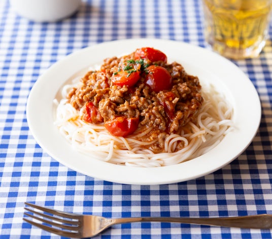 電子レンジで簡単に作れるミートソースをかけたライスパスタレシピです。