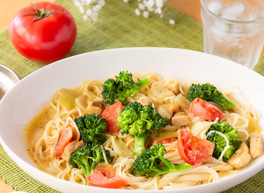 野菜がごろごろ入った、ほんのりカレー風味のグルテンフリークリームパスタです。豆乳を使い、ライスパスタ由来のゆで汁でとろっとしたソースに仕上げています。