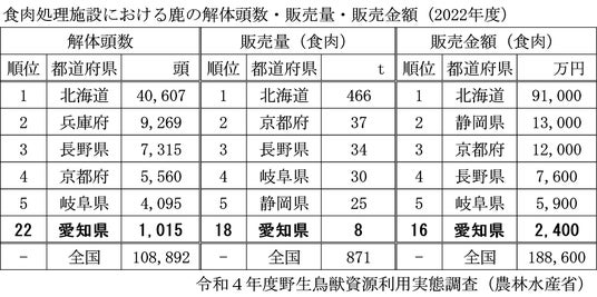 愛知県では、野生鳥獣による農作物被害軽減対策を推進する中で、愛知県内で捕獲され、県内の処理加工施設で処理されたイノシシとニホンジカの肉(ジビエ)を「愛知産ジビエ」として地域資源に位置付け、利活用を推進しています。