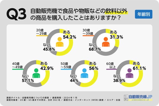 男性回答者の48.4%が自動販売機で飲料以外の商品を購入した経験があると回答しました。これに対し、女性回答者では購入経験があると答えたのは43.5%に留まり、男性よりも若干低い購入経験率となりました。