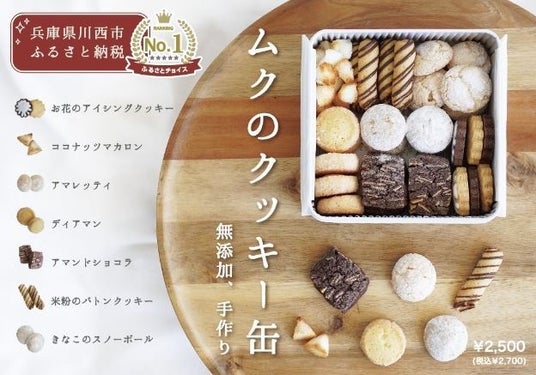このクッキー缶は手作りの無添加で体に優しい国産素材を使ったクッキーです。素材のそのままの味わいが人気の秘密です。プロパティシエによる指導のもと、障がいを持つ方々が焼き菓子を20種類以上毎日焼き上げています。その中でも特に人気の7種類のクッキーをぎっしりと詰め合わせたクッキー缶が大好評を頂いています。一日に30缶以上を売り上げることもあります。2022年に川西市のふるさと納税のサイト『ふるさとチョイス』に登録したところ、たちまち評判となり、2022年・2023年のNo.1に2年連続で選ばれました。