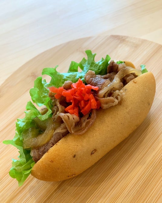 人気商品の「牛丼パン」。他にも「たこわさ」や「しそベーゼ」など、ユニークな惣菜パンが店頭に並んでいます。