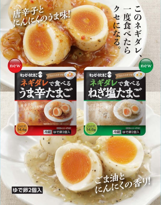 そこで、キユーピーグループ独自の技術を活用し、開封してすぐに食べられる商品を開発しました。ラインアップは、唐辛子とにんにくのうま味がきいた「うま辛たまご」と、ごま油とにんにくの香りが食欲をそそる「ねぎ塩たまご」の2品です。賞味期間が冷蔵で45日間あるため、冷蔵庫にストックしておくこともできます。