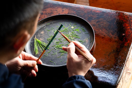 漆の上に置いた松葉、生糸、菜種などの素材の形を、細かな卵殻で表現する希少な技法。