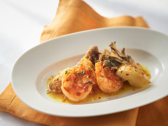 アヒージョ風ソースに相性の良い海老、舞茸、ポテトを合わせました。