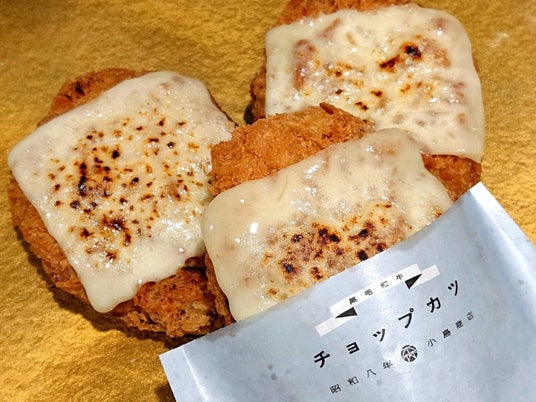 肉卸小島自慢の黒毛和牛チョップカツ。お肉を包丁でチョップして作る、超粗挽きでジューシーなチョップカツにチーズのコクがベストマッチ。