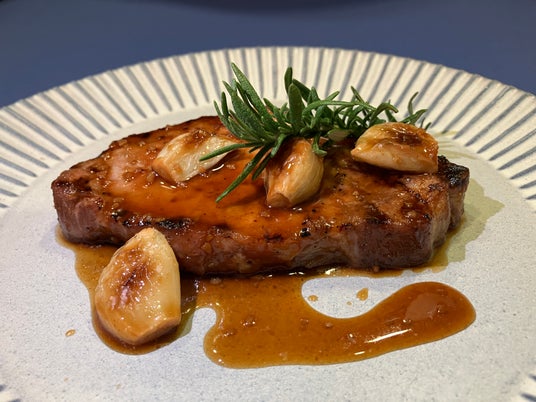 米澤豚ロースの厚切り(230g)をグリルで丁寧に火入れをし、たっぷりのにんにくを漬け込んだ醤油ベースのソースで仕上げました。厚切りステーキは通常の2倍の厚さです!※限定20点
