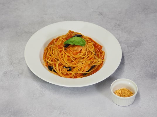 ナスとベーコンのトマトソースパスタに2/29限定でニンニクを増量しました!普段のメニューにはついていないガーリックチップも追加できます。カフェ・キッサカバどちらでもお楽しみいただけます。