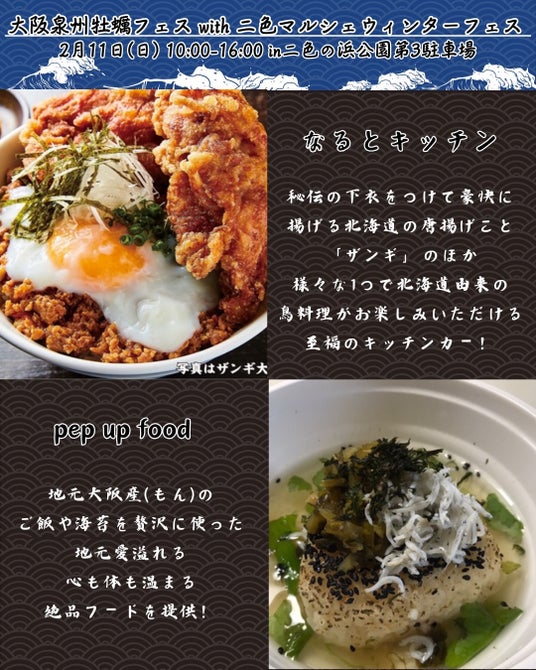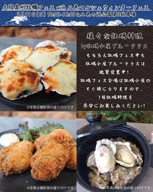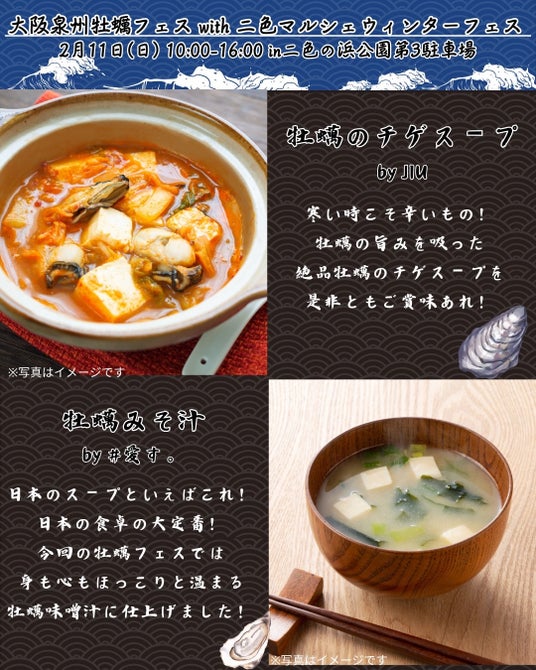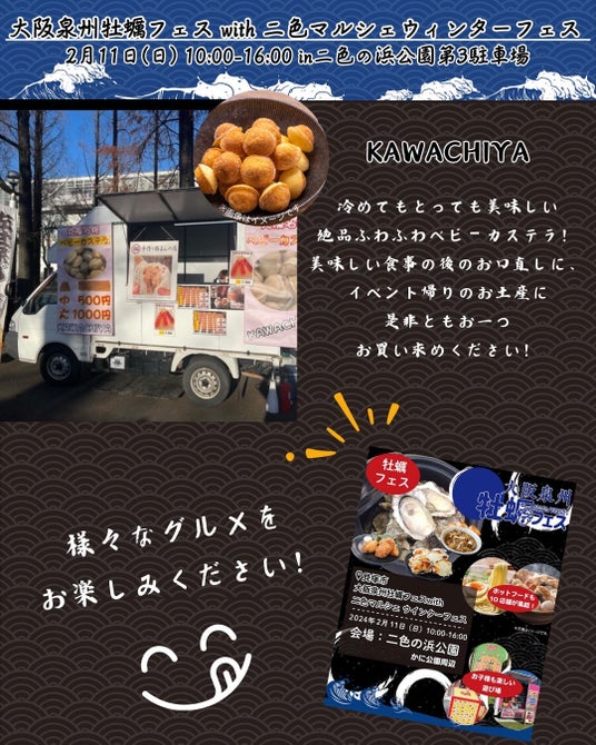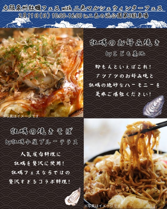 当イベントは大阪泉州牡蠣フェスと温かいフード等が出店する二色マルシェウィンターフェスのダブルフードイベント。冬の味覚の代名詞である牡蠣と、冬にぴったりなホットフードをお楽しみ頂けます!