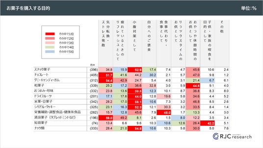 ● 個々のお菓子でみると、グミ・キャンディ・ガムや清涼菓子 (タブレットミントなど) は、 「疲れている時のリフレッシュ」 を目的で、和菓子は 「自分へのご褒美」 としての目的が特徴として挙がる。