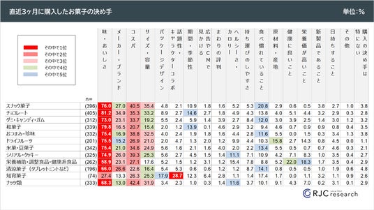 ● お菓子を購入する決め手は、 「味」 が最も突出して高く、 「コストパフォーマンス」 「サイズ・容量」 「メーカー・ブランド」 が続く。