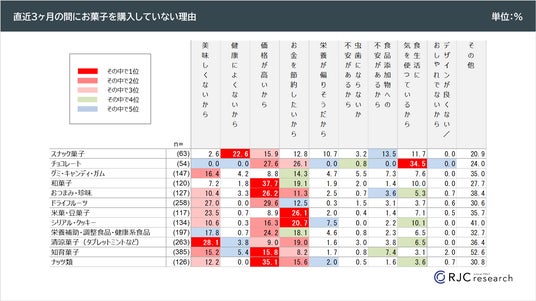 ● お菓子を購入しない理由としては 「価格の高さ」 や 「お金を節約したいから」 といった金銭面でのハードルと、 「味」 がどのお菓子においても主な要因となっている。