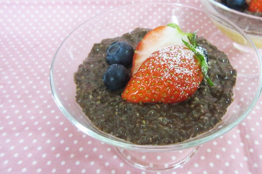 かぼちゃプリンに、スーパーフードとよばれているチアシードを使ったチョコソースをあわせました。ぷちぷちとした食感がくせになります。