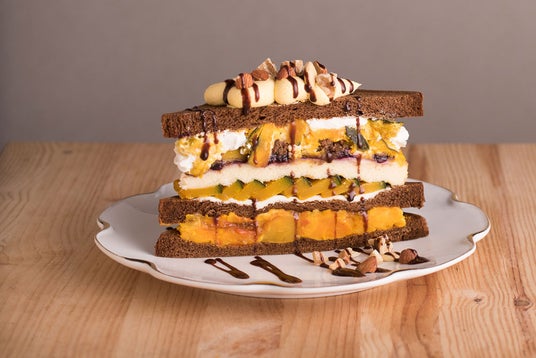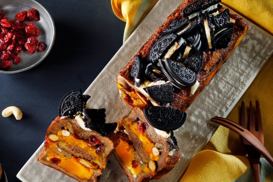 見た瞬間に伝わるボリューム感、鮮やかな色合いと美しい模様でインパクト抜群。まるでアートような断面の、かぼちゃを究極に楽しむサンドイッチです。チョコソースをかけて召し上がれ!