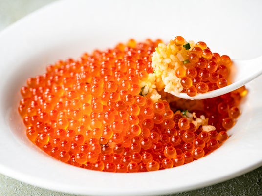 鮭のほぐし身を入れたクラブチャイナの特製炒飯に、見えなくなるほどたっぷりイクラをのせた一品。選べる3サイズ。