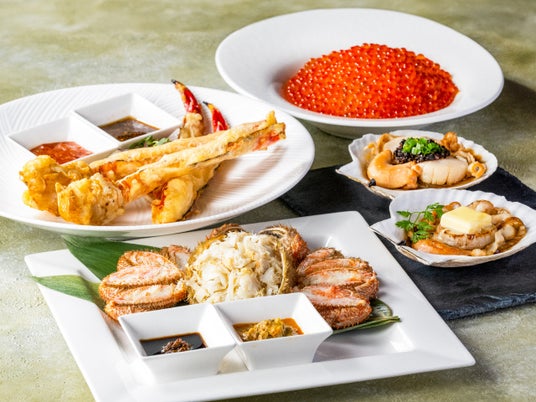 北海道に来たら食べたい、毛ガニやホタテ、イクラ、鮭などの海鮮や、ホクホクで美味しい北海道のじゃが芋やかぼちゃなど道産食材を使った見た目も豪快なお料理。北海道の魅力をクラブチャイナのアレンジで豪華にお楽しみいただけます。