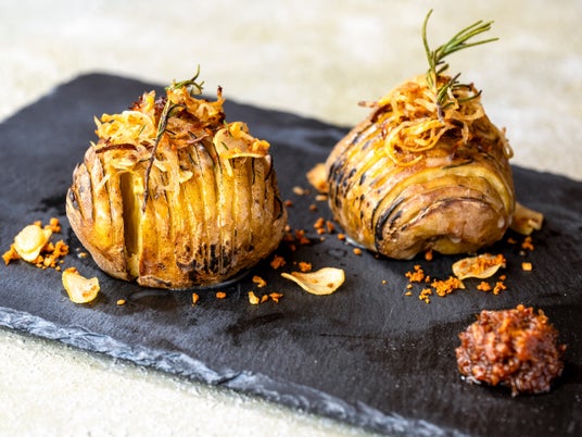北海道の品種・きたあかりをオーブンでじっくり焼き上げたじゃがバター。添えられたXO?をつけて中華風の味変をお楽しみいただけます。