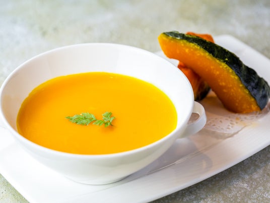 かぼちゃの甘みを活かしたかぼちゃスープ。かぼちゃのオレンジが鮮やかな、寒い季節におすすめの一品です。
