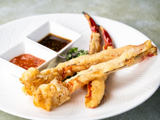 タラバ蟹の大ぶりな脚2本を、そのまま衣をつけてフライにしました。蟹の旨味にあう、オリジナルの2種類のソースでお楽しみください。