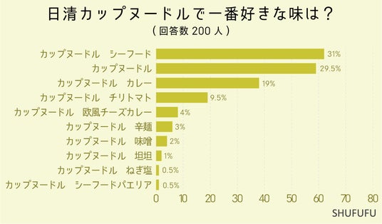 日清カップヌードルで一番好きな味は?の問いに対して最も多かったのが「カップヌードル シーフード(31%)」でした。 次いで「カップヌードル(29.5%)」「カップヌードル カレー(19%)」という結果でした。 ノーマルのカップヌードルは醤油とチキン味で癖がなく、よくお店でも見かけるので定番のようです。