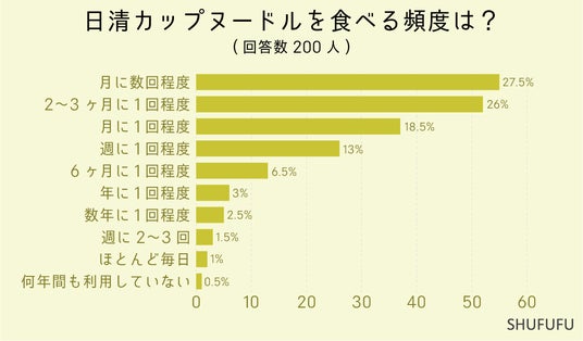 男女200人に「日清カップヌードル」に関するアンケート調査を行った所、日清カップヌードルを食べる頻度では