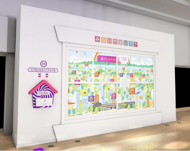 世の中には無駄に捨てられてしまう材料がまだまだいっぱいあります。「そうぞうファクトリー」では、ご見学者が実際にハンドルを回しながらそのような材料をゲットします。そして、たたいたり・こねたりといった工程を経ておいしい「未来の食べもの」に変身させた後、色をつけたり、デコレーションしたりして、カプセルに梱包し、「未来の世界」へ出荷します。「みらいウィンドウ」では、ご見学者がつくった「未来の食べもの」が「おいしイイネ!」の点数として評価され、未来をどのように変えるか見ることができます。また、ご見学者のつくった「未来の食べもの」と「未来の世界」の前で記念撮影をすることができます。これらの体験を通じて、フードロスなどの社会課題を楽しく学ぶことができます。
