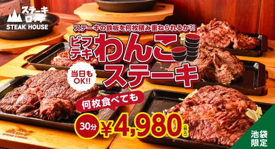 株式会社ファイブグループ(東京都武蔵野市:代表取締役社長 坂本憲史)の関連会社である、株式会社B級グルメ研究所(本社:東京都武蔵野市、代表取締役社長:坂本 憲史)が運営するステーキハウス『ステーキロッヂ 池袋店』で、2024年2月9日(金)より「ビフテキわんこステーキ」の提供を開始いたします。2月9日の肉の日に挑む甲斐のある30分食べ放題制で、2月11日の「わんこそば記念日」も同時に祝える特別なメニューです。ぜひこの機会にお腹いっぱいお楽しみください。